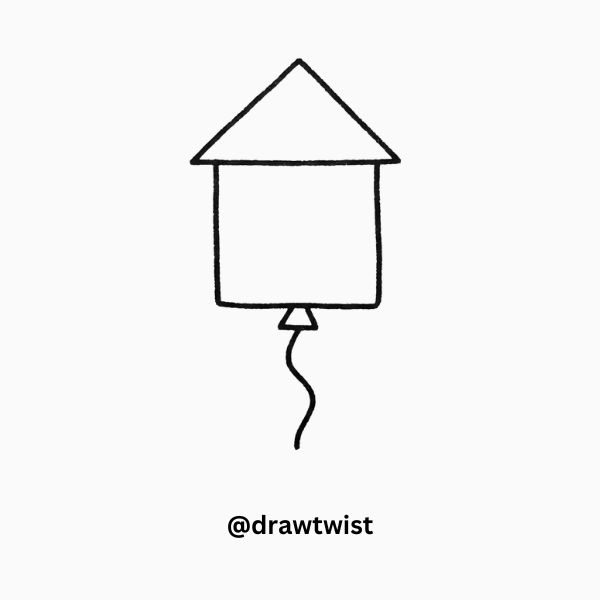 Draw a square for the house. Add a triangle roof on top. Draw a string under the square. This balloon looks like a tiny floating house and is easy to draw.