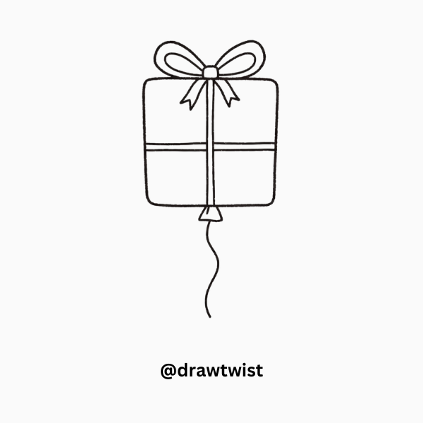 Draw a square for the gift box. Draw one vertical and one horizontal line inside it to show ribbon. Add a simple bow on top. Draw a string at the bottom. This balloon is great for birthday drawings.