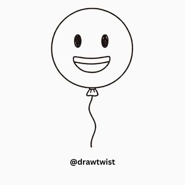 Draw a round balloon shape. Add two small dots for eyes and a curved line facing down for the mouth. Add the string at the bottom. This balloon helps kids understand emotions while drawing something very easy.