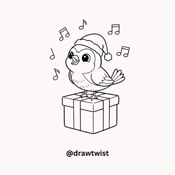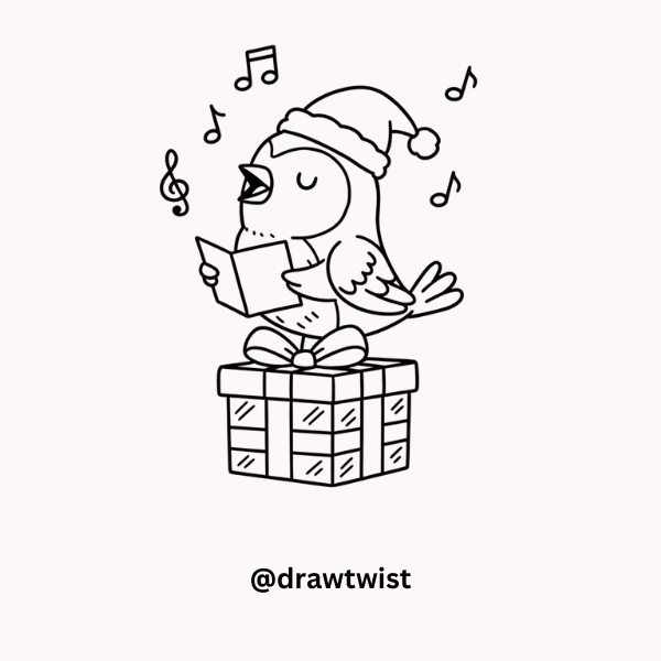 Draw a small bird holding a music sheet and singing Christmas carols. Kids can add musical notes and a Santa hat. The bird can be sitting on a branch or a gift. This doodle is simple, fun, and encourages imagination.