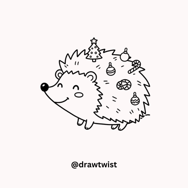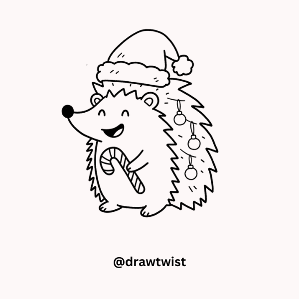 Draw a hedgehog wearing a Santa hat and holding a candy cane. Kids can add tiny snowflakes and a smile. The hedgehog’s spiky back can be decorated with little ornaments to make it extra festive.