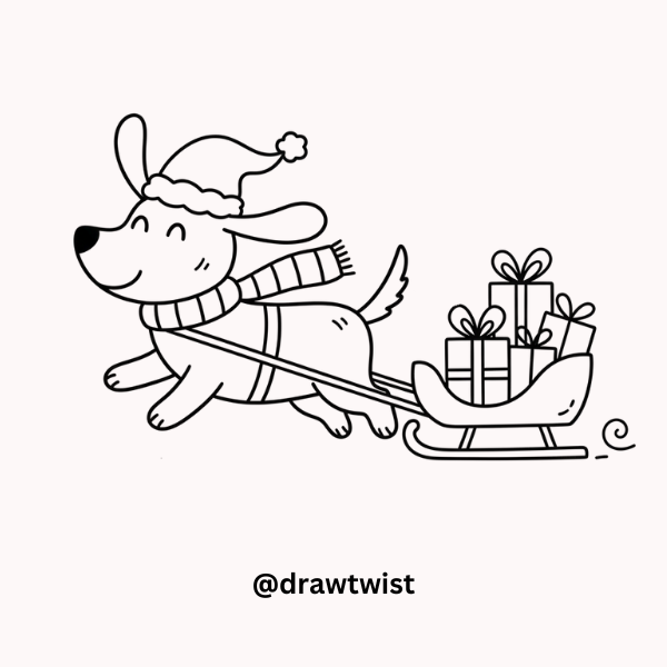 Draw a dog pulling a tiny sleigh filled with gifts. Add a scarf on the dog and a Santa hat for extra fun. Kids can imagine the dog running through the snow while carrying presents for friends. This doodle helps with drawing motion and action poses.