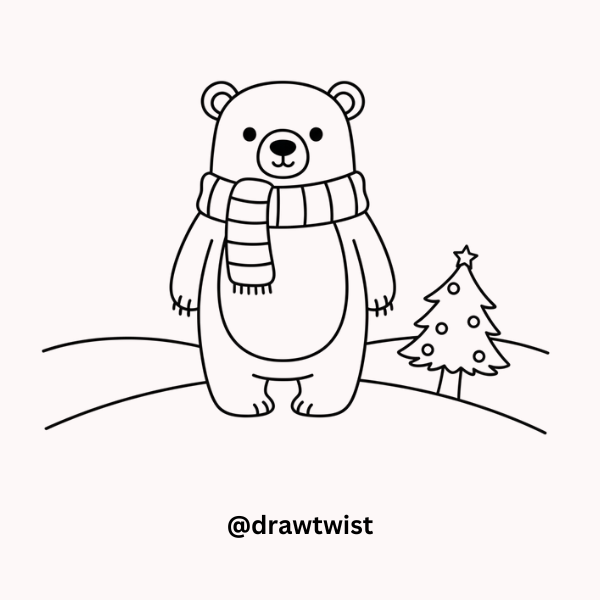 Draw a polar bear wearing a knitted scarf, standing on a snowy hill. Kids can add a small Christmas tree in the background. Coloring the bear white with a red scarf makes it festive and cute.