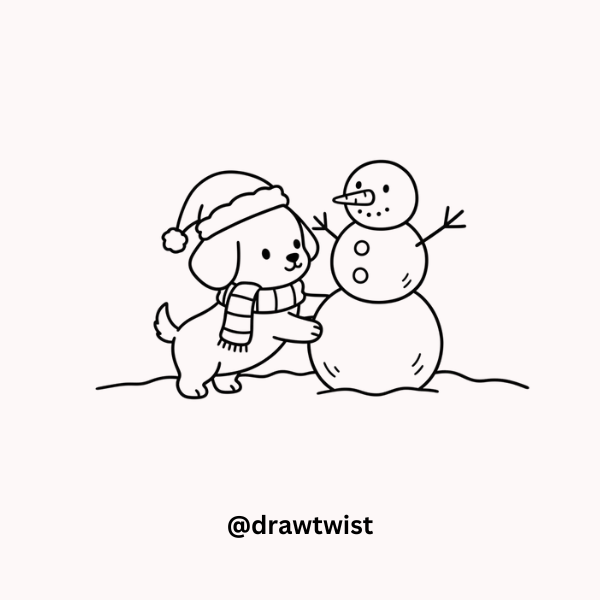 Draw a small dog helping build a snowman. Add a carrot nose and buttons on the snowman. Kids can make the dog wear a tiny scarf and hat. This doodle is fun because it combines animals and classic Christmas elements.