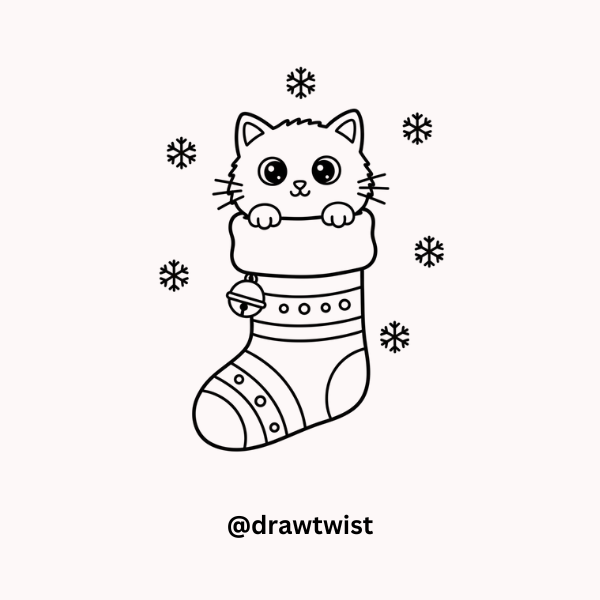 Draw a fluffy cat sitting inside a Christmas stocking. Give it big eyes and a small nose. You can add a little bell on the stocking and some snowflakes falling around. Kids can imagine the cat peeking out of the stocking while waiting for Christmas morning. This doodle encourages creativity with colors and patterns.