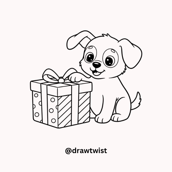 Draw a playful puppy sitting next to a big wrapped gift. The puppy can have floppy ears and a wagging tail. Kids can decorate the gift with bright colors and patterns. They can also imagine the puppy trying to open the present or play with the ribbon. This doodle is perfect for practicing simple shapes like circles and ovals.