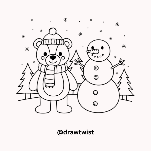 Draw a teddy bear standing next to a snowman. The bear can have a scarf and a hat while the snowman has a carrot nose and buttons. Kids can add falling snow and tiny trees in the background. This doodle is fun because it combines animals and Christmas decorations in one scene.