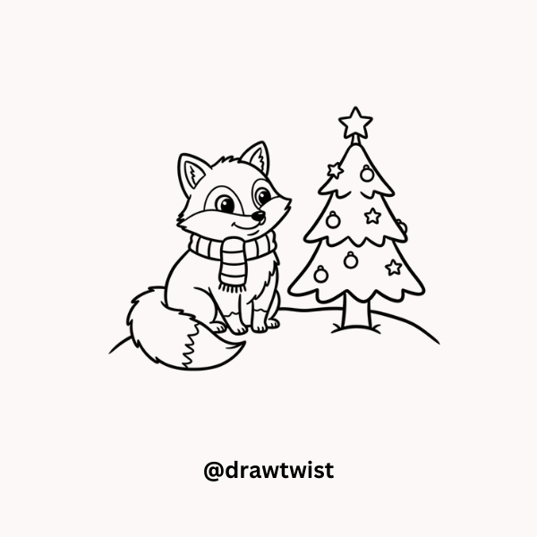 Draw a little fox wearing a scarf and sitting near a Christmas tree. The fox can have a fluffy tail and a smiling face. Kids can imagine the fox waiting for Santa while sitting on soft snow. They can decorate the tree with tiny ornaments or stars to make it more festive.