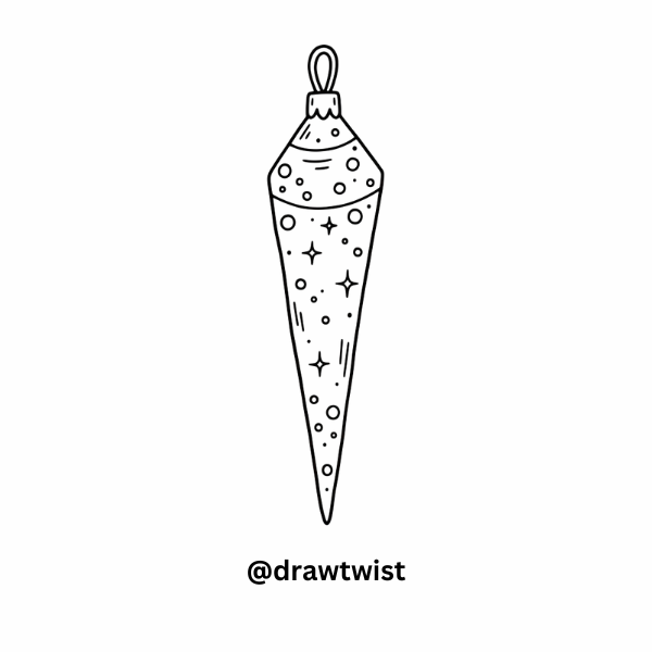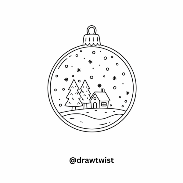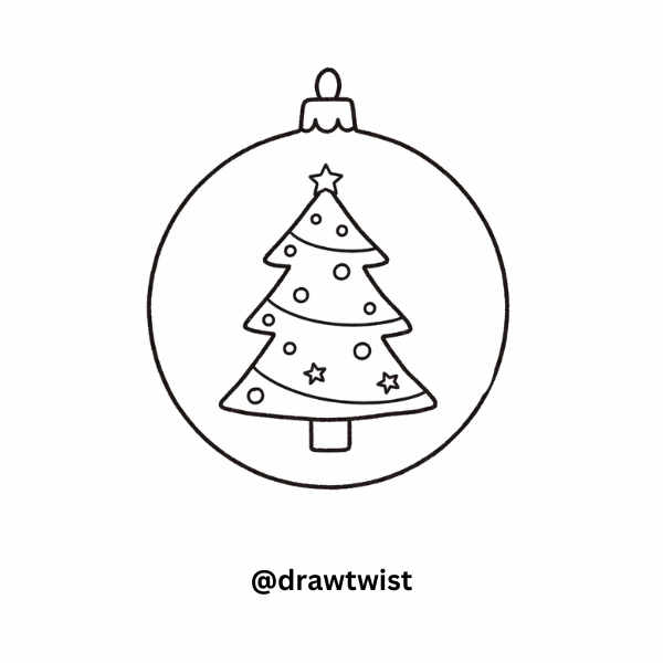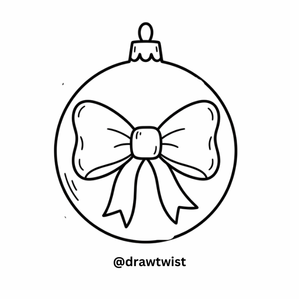 The classic round ornament is simple and perfect for beginners. Start by drawing a circle and adding a tiny hook at the top. This hook can be drawn as a small curved line, which shows where the ornament hangs.