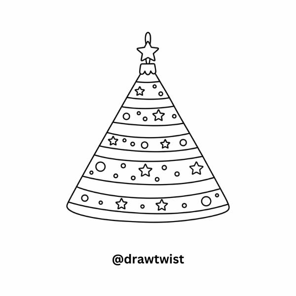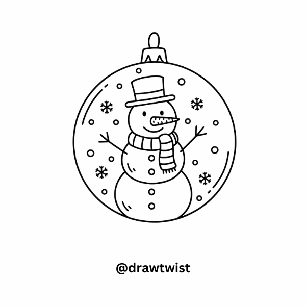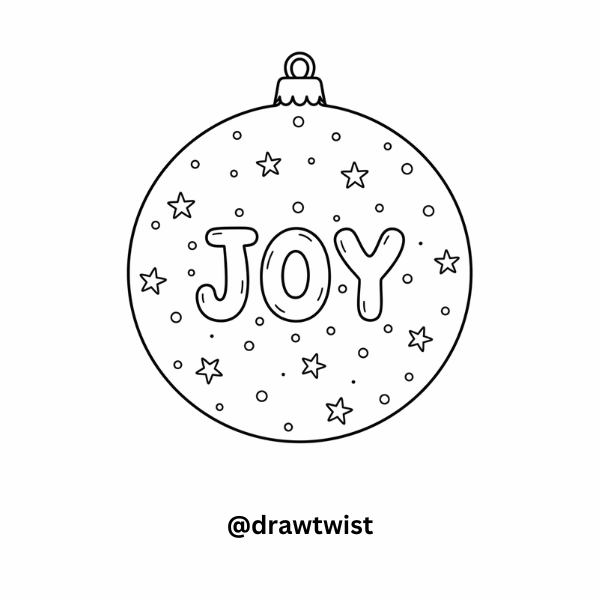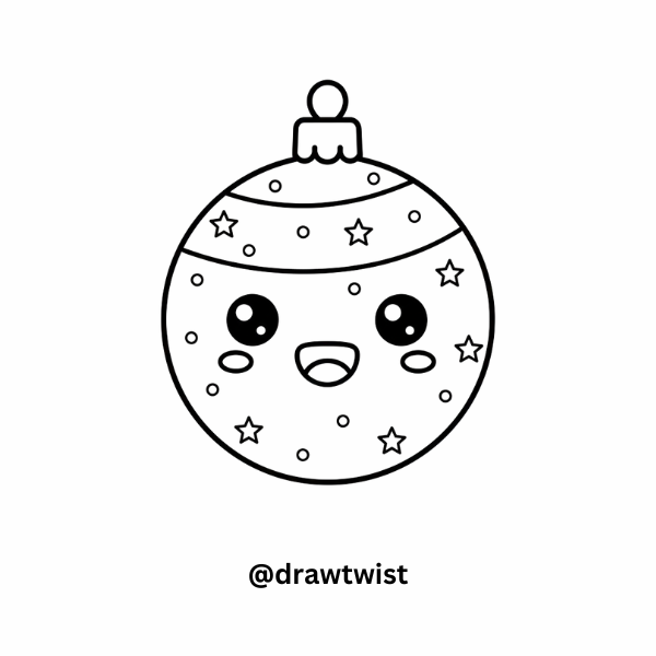 Draw a round ornament and give it a cute face. Add eyes, a smile, and rosy cheeks. Kids can make the ornament happy, silly, or sleepy. Tiny stars, dots, or stripes around the ornament add extra charm. Face ornaments are playful and help kids practice drawing expressions.
