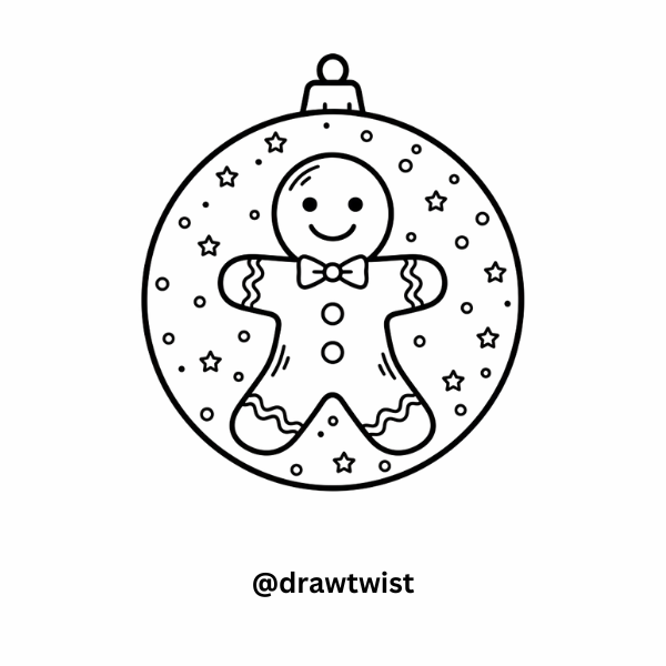 Draw a gingerbread person inside a round or heart-shaped ornament. Add icing patterns and buttons. Kids can color the cookie brown and the decorations in bright colors. Tiny dots, stars, or lines add fun details. Gingerbread ornaments add a sweet, cozy feeling to Christmas doodles.