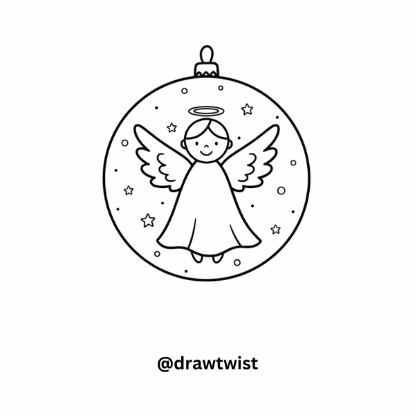 Draw a simple angel with a round face, wings, and flowing dress. Add a halo on top. Color softly in yellow, white, or gold. Tiny stars or dots around the angel make it shine. Angel ornaments add a magical, peaceful feeling to holiday drawings and are easy to draw for kids.