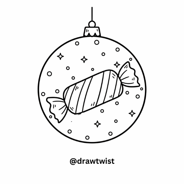 Draw a small candy with a wrapper inside a circle or as a standalone ornament. Color the wrapper in bright shades. Kids can add stripes, dots, or tiny bows. This ornament adds sweetness to any drawing collection. Multiple candy ornaments together look cheerful and fun.