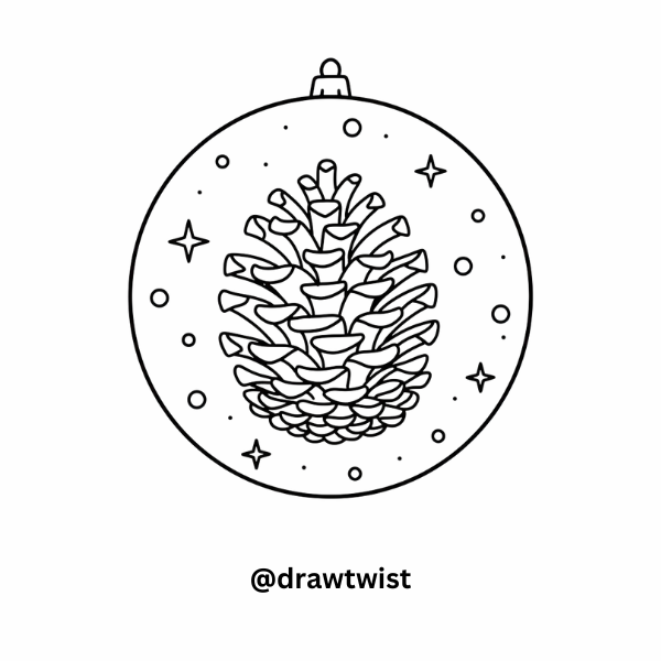 Draw a pinecone shape inside a circle. Add small lines to show texture and color it brown or gold. Kids can add tiny dots or stars around the pinecone for extra details. Pinecone ornaments give a natural, wintery touch to your Christmas drawings.