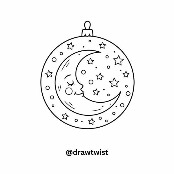 Draw a crescent moon and tiny stars inside a round ornament. Color the moon yellow and stars white or silver. Adding a soft blue background makes it look like a night sky. This ornament creates a calm, magical winter feeling in your doodle collection.