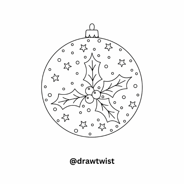 Draw holly leaves and berries inside a round ornament. Add tiny lines for leaf details. Color the leaves green and the berries red. Tiny white dots or stars make it more festive. Holly ornaments give a classic Christmas feel and look great with round or star-shaped ornaments.