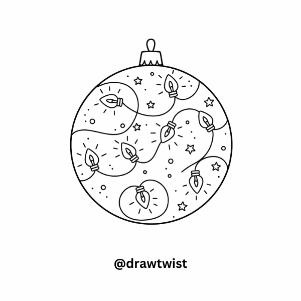 Draw a small string of lights inside a round ornament. Color the bulbs in bright shades like red, yellow, green, and blue. Add a tiny glow effect around each bulb to make them shine. Kids can also add small sparkles for extra magic. This ornament is lively and cheerful, perfect for a playful doodle page.