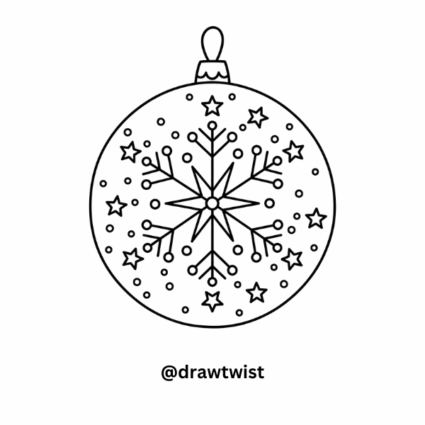 Snowflakes are perfect for winter-themed ornaments. Start with a circle and draw simple lines radiating from the center. Add smaller lines, triangles, or dots at the ends. Each snowflake can look different, so kids can make many unique designs. Coloring them in light blue or silver makes them look icy and magical. This ornament can be drawn alone or among other ornaments for a winter wonderland effect. Kids can also add tiny stars or dots around the snowflake.