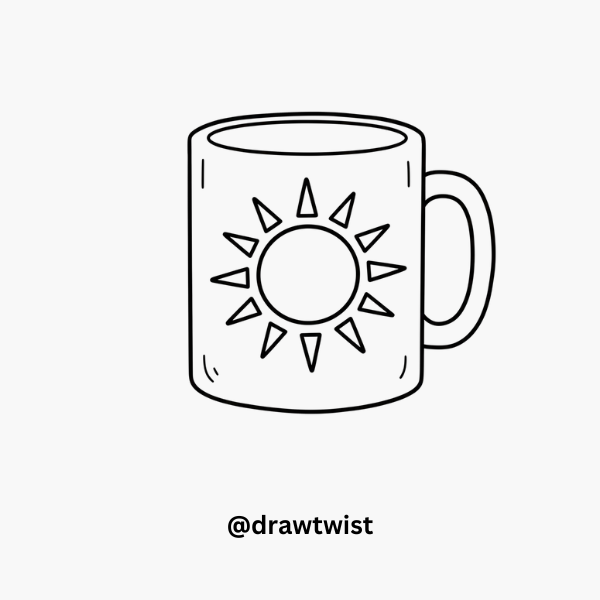 A sun mug is bright and happy. Draw the mug and add a simple sun shape on it. Kids can color the sun yellow or orange. This drawing is cheerful and perfect for a sunny morning vibe.